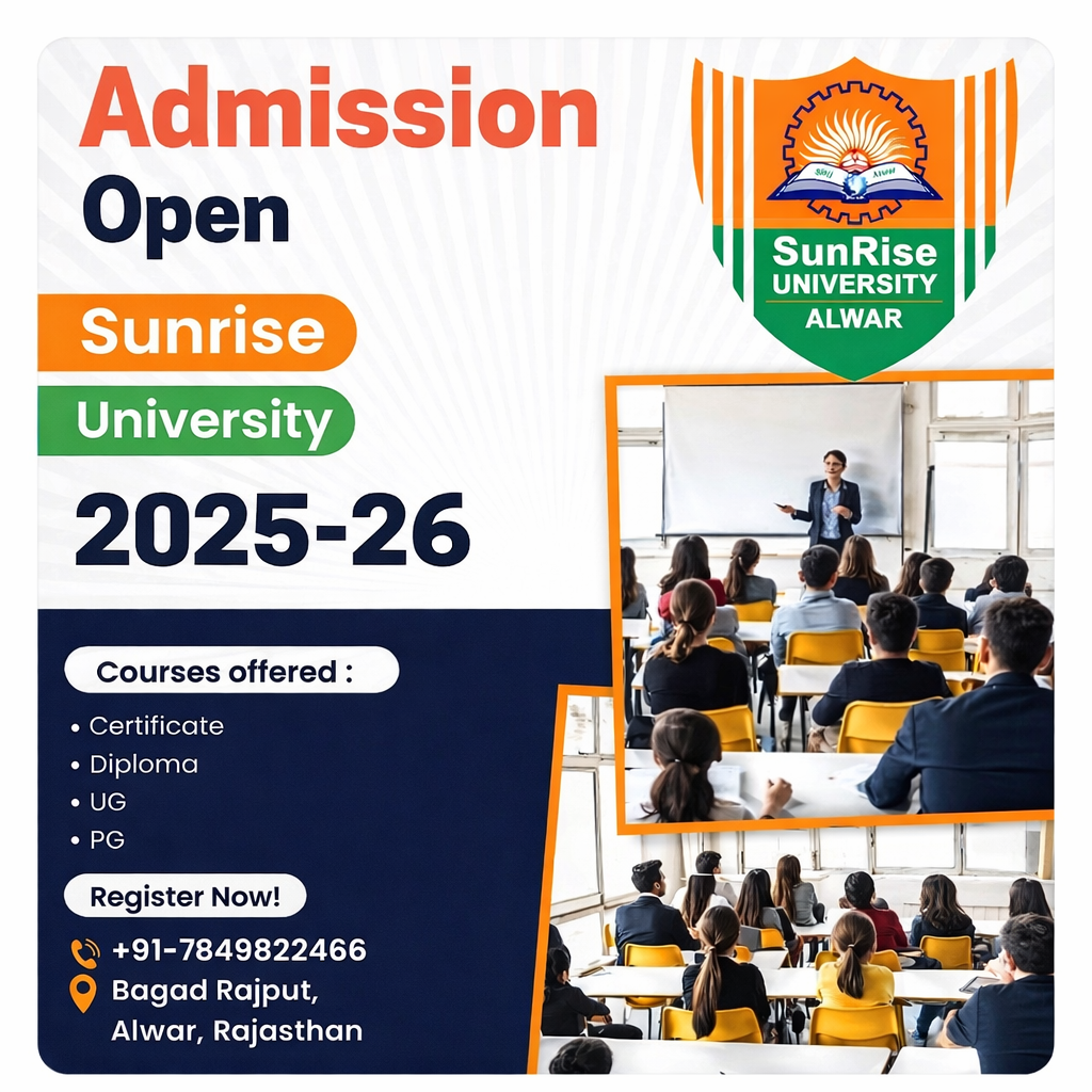 The new academic session at Sunrise University, Alwar is now open, welcoming aspiring students to begin their journey toward academic excellence and professional success. Recognised for quality education, modern infrastructure, and industry-oriented programs, Sunrise University offers a wide range of Undergraduate (UG) and Postgraduate (PG) programs across diverse disciplines.